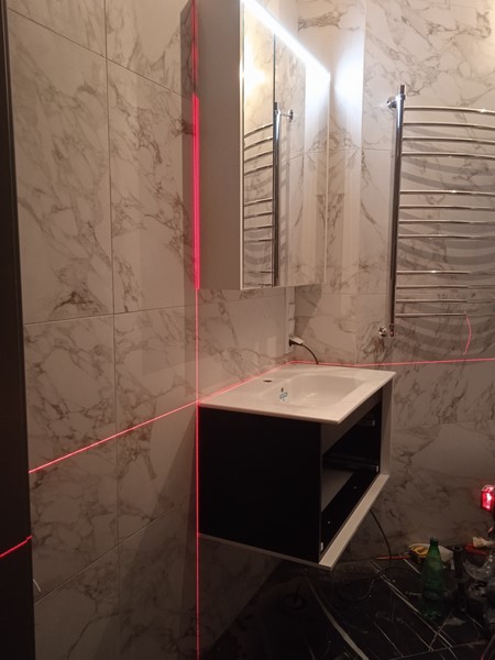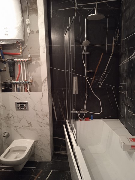 Керамогранит крупноформатный.Разводка воды,канализация в станах.Шумоизоляция стояк.Укладка теплого пола.