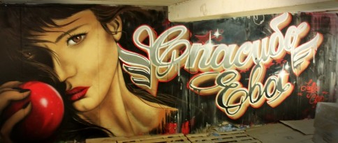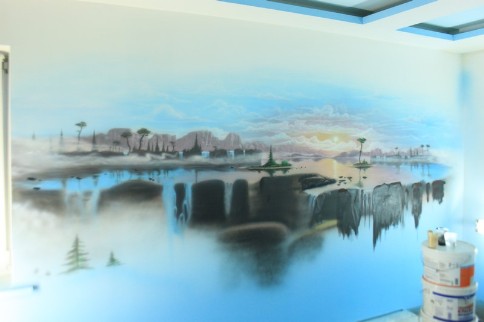 Граффити Вантового моста на 23 этаже. Так и не смогли найти нужную нам картинку.В итоге взяли квадрик,ночью полетали над мостом и сняли её себе сами.Дальше она на стене.